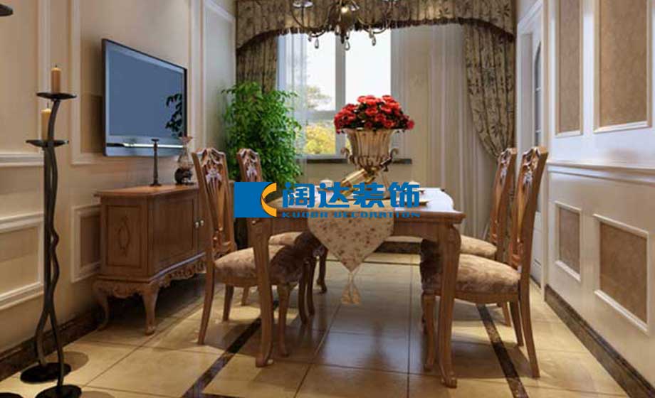 餐廳:餐廳的背景墻與沙發(fā)背景墻形成呼應的狀態(tài),使房屋效果更加整體。地面也做了功能區(qū)域區(qū)分,不會讓人產(chǎn)生區(qū)域錯覺。