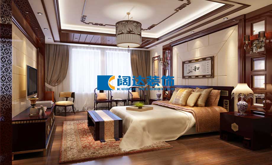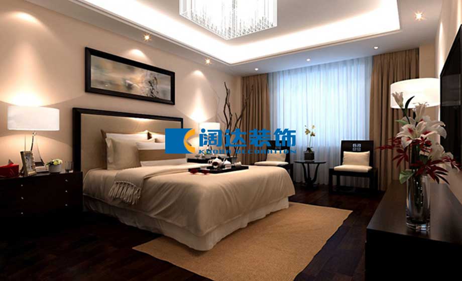 主臥室:本案的主臥室傳承了新中式的風格,中式的吊頂和造型床頭背景使的臥室空間充實著中國文化氛圍。