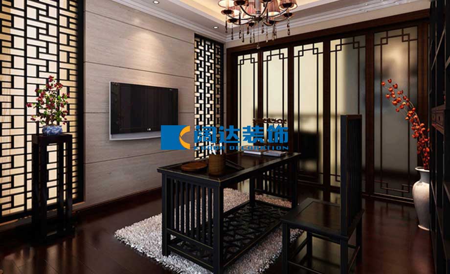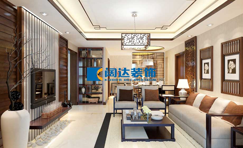 客廳:本案對客戶沒有拆改變動,充分體現出來新中式設計元素,頂面的中式實木線條的裝飾和電視墻相互呼應,彰顯了新中式的雅致和大氣,地面用了溫馨色彩的微晶石地磚,是整個客戶有了延伸感。