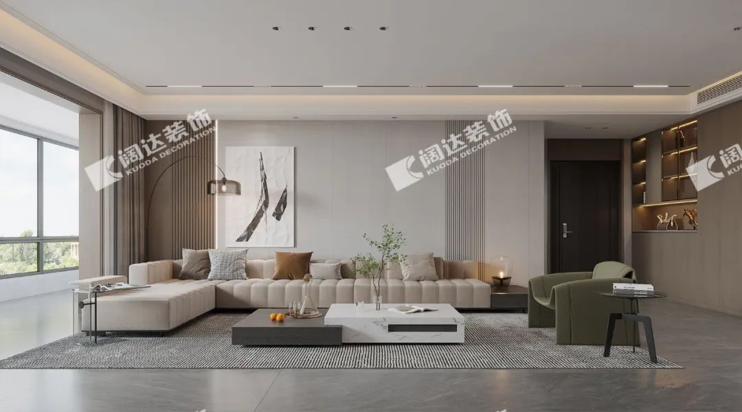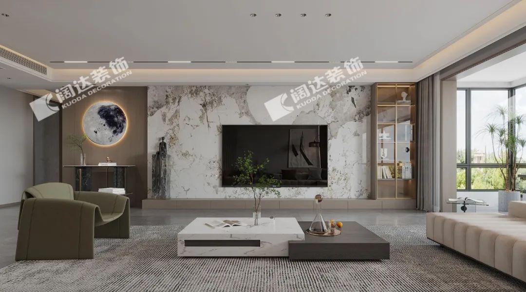 本案通過巖板、墻板、定制電視柜、定制酒柜的設(shè)計(jì),頂面采用無主燈線性軌道燈設(shè)計(jì),墻頂?shù)囟嗑S空間,雖然簡潔,但收納功能強(qiáng)大,且最大程度減少后期打掃衛(wèi)生的繁瑣性。多種材質(zhì)和諧地融為一體,滿足了不同年代人們共同的審美需求。空間開闊、舒適,呈現(xiàn)質(zhì)感的雅奢風(fēng)范。
