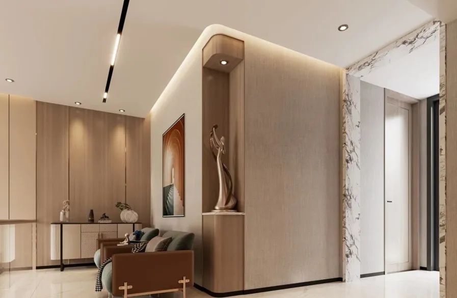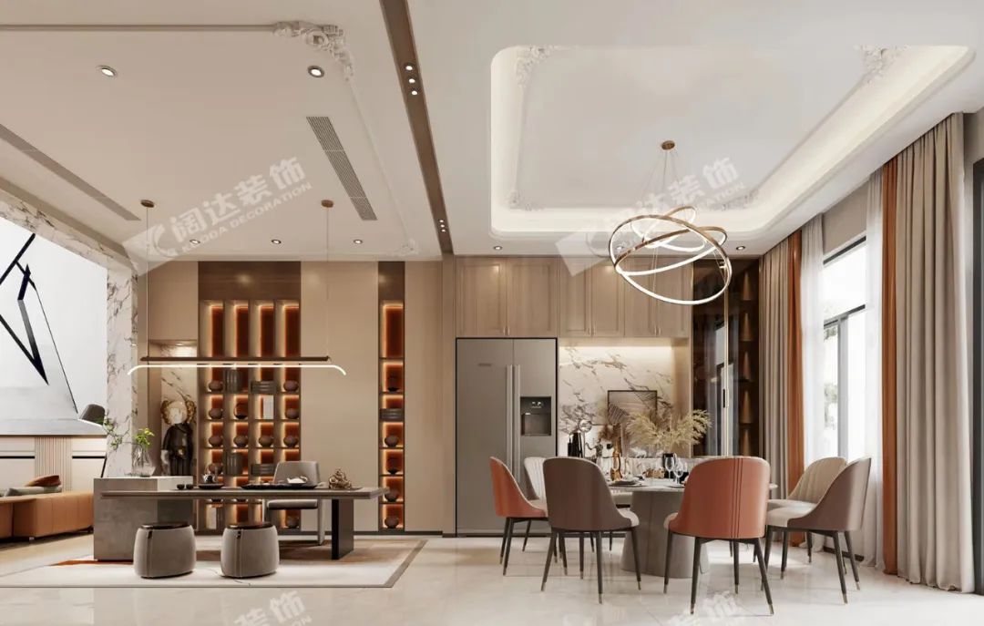 客廳:溫暖明亮,經(jīng)濟耐看是本案的主要需求之一,剔除了法式復雜的線形后,融入了現(xiàn)代溫暖明亮的暖色系風格,材質(zhì)上搭配巖板,給予了視覺上的沖擊力,成為業(yè)主期待的理想之家。