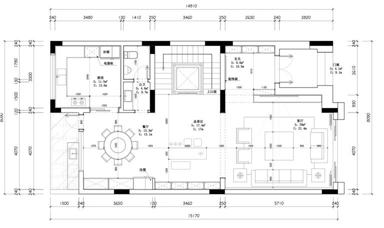 一樓:通過改造擴大了餐廳面積,同時新設了茶區(qū)的功能。色彩和材質(zhì)的搭配讓整個空間更明亮干凈。