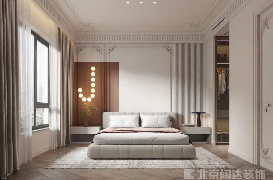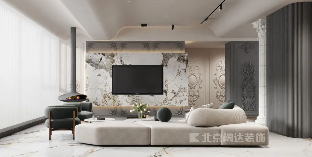 嵌入式設(shè)計(jì)的電視背景墻,結(jié)合巖板和法式線條護(hù)墻板,懸掛壁爐浪漫又不失質(zhì)感,既保留了法式的柔和,也融入了現(xiàn)代的大氣。圓弧形的吊頂上,嵌入式無主燈散落在“星盤”里,給予生活最自然浪漫的光影支持。