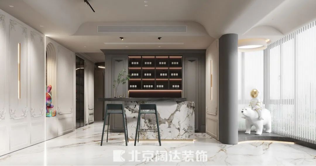 客廳擁有奢闊的開間和采光,這里是孩子們的玩樂天地,也是家人互動交流的空間。將開放式品酒區(qū)、兒童玩耍區(qū)和陽臺融為一體,讓公區(qū)盡量擴(kuò)大,釋放出充足的活動空間。