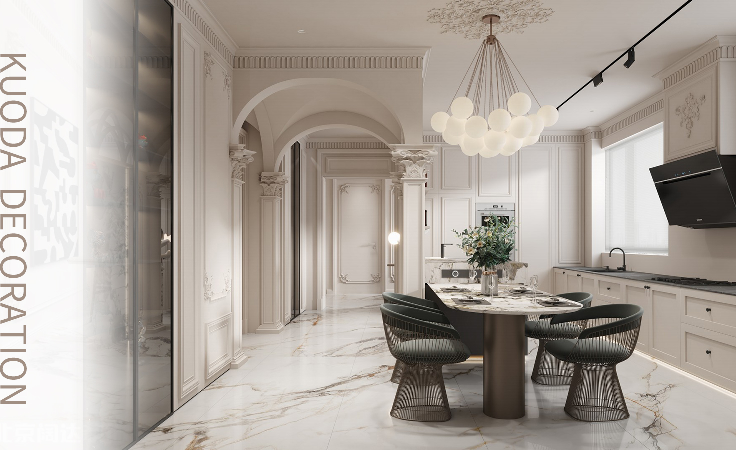人間浪漫不過日出東方。把日出定格家中,一餐一食,皆溫柔。延續(xù)客廳的浪漫基調(diào),復(fù)古的壁畫為餐廳融入美好氛圍感;絲絨與羊羔絨餐椅將法式的優(yōu)雅完美表達(dá)。在功能上,增加島臺與餐邊柜,安裝小水槽和直飲機(jī),縮短生活動線,提升家居舒適度。