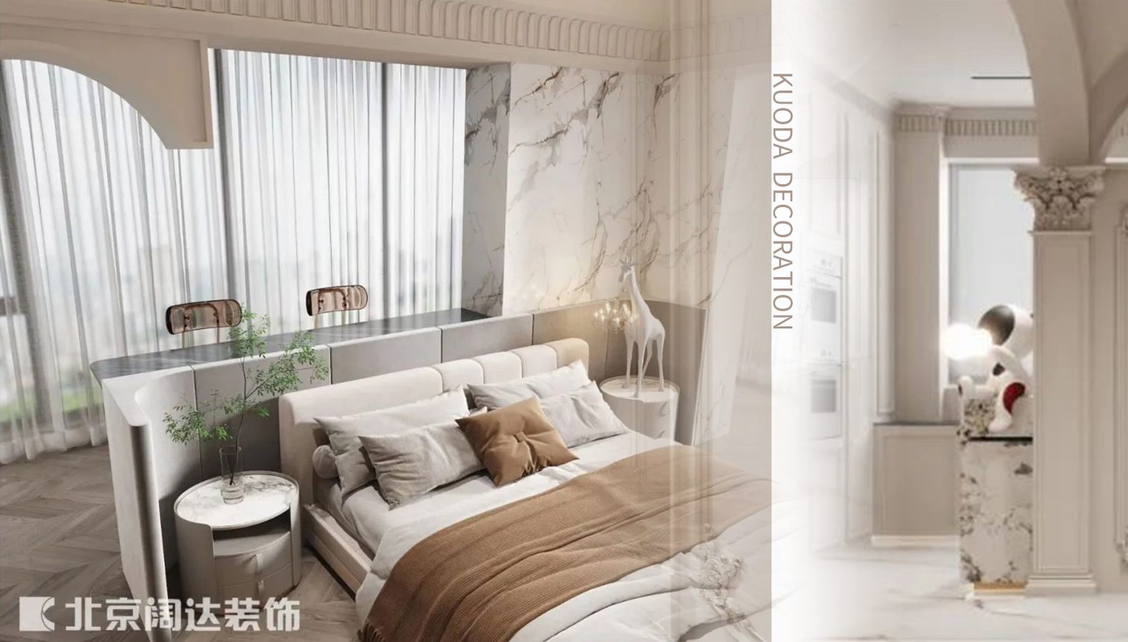 主臥床頭背景軟包與巖板組合,豐富空間的立體和層次感。奶油色藝術(shù)涂料似將月光打翻傾瀉一室,燈線于頂部游走,個(gè)性臺燈守護(hù),夢幻的紗簾將屬于臥室的柔軟和浪漫氛圍拉滿,成全每一晚的好眠。