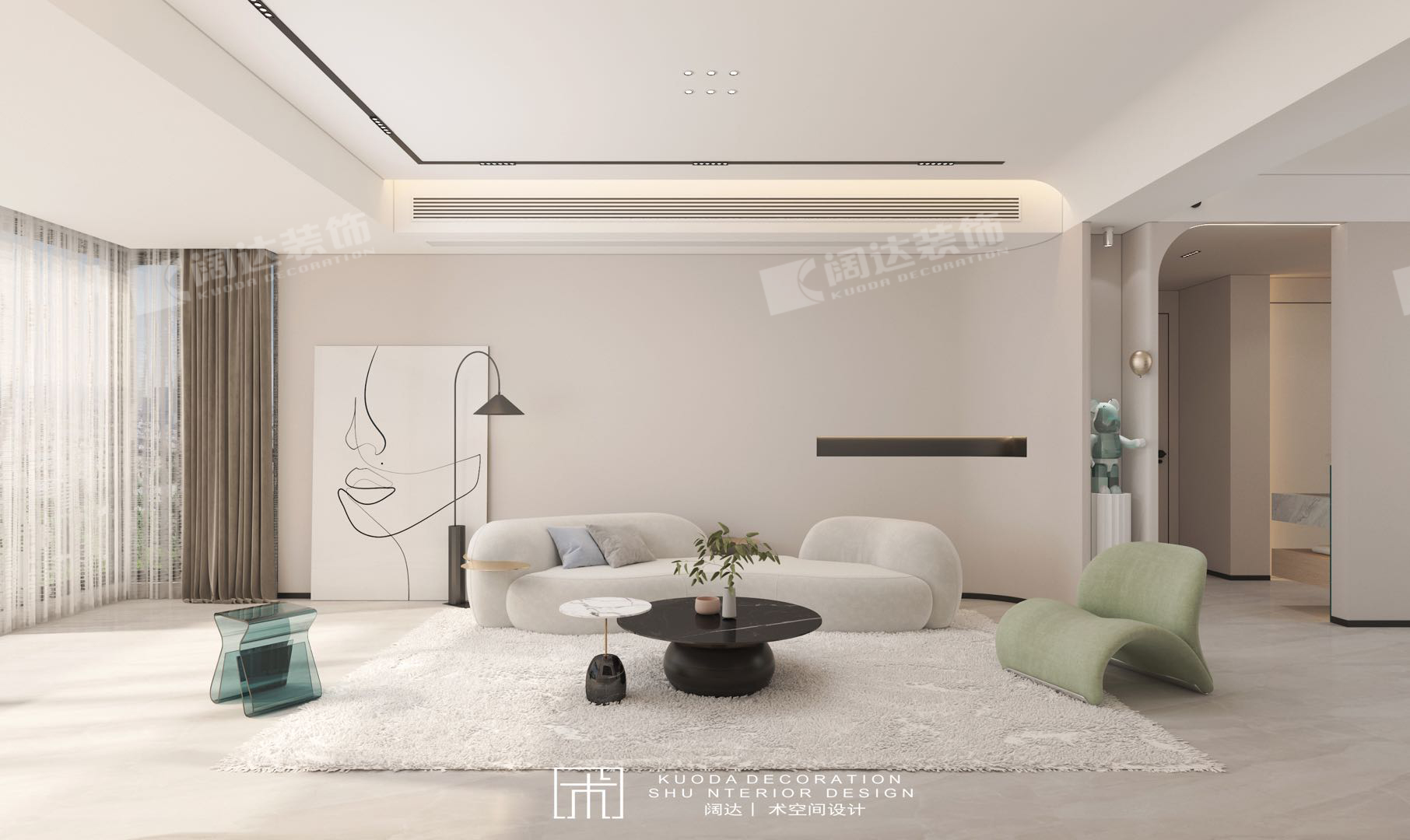 以淡奶油色為基調,大量的圓弧曲線在室內以不同的方式進行呈現,既隔斷了空間,處理了頂上的大梁,又能在造型上展現不一樣的美。搭配簡單的線條畫,給人簡單高級的感覺。