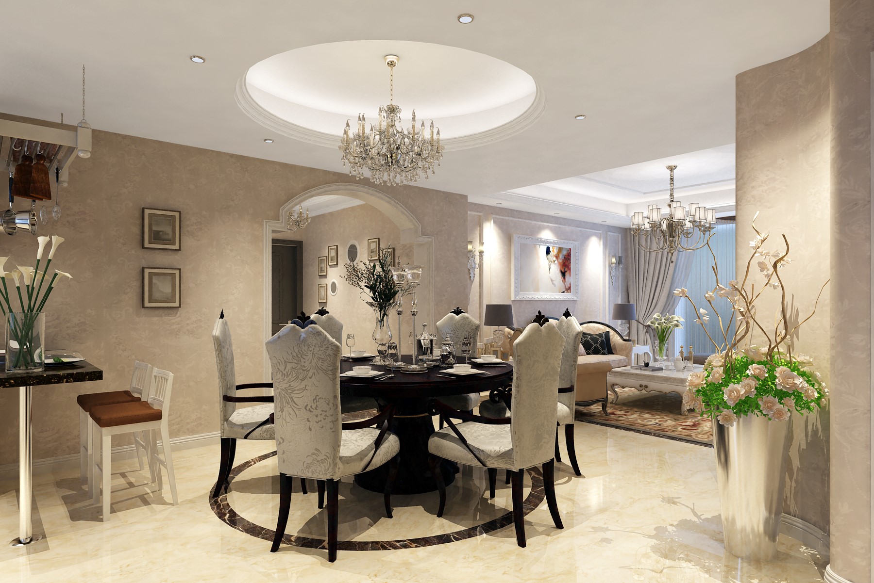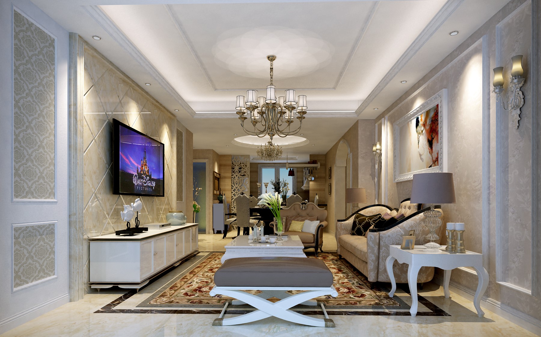 本案例采用簡歐風格裝修,客戶為一對時尚年輕人,比較喜歡年輕時尚的新鮮事物。歐式風格為大部分女性喜愛的風格,裝飾的柔美性,家具的曲線美,是年輕人展示自我的舞臺。結合開放式的裝修模式,把空間的靈動性完美的展現出來。